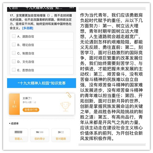 2018年4月15日晚9点,支部书记陈皆播同学运用网络问卷技术,将设计好的竞赛题目发至班级微信群,并说明了竞赛规则,全体同学准时在线上进行答题。这些题目分为客观题和主观题,其中客观题由单项选择和多项选择组成,主要涉及十九大报告中的重要思想、重要观点、重大判断、重大举措。同学们纷纷反映主观题题目设计贴近我们的专业及生活,让人深有共鸣。
