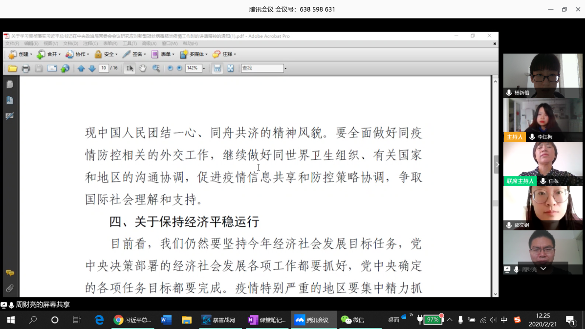 和巨乳a片的统一部署与要求,体质与健康教研室全体党员认真学习了习近平总书记在中央政治局常委会会议研究应对新型冠状病毒肺炎疫情工作时的讲话精神。会议采用腾讯视频会议的形式开展,党支部全部12名师生党员参加会议。支部书记任弘老师主持会议。