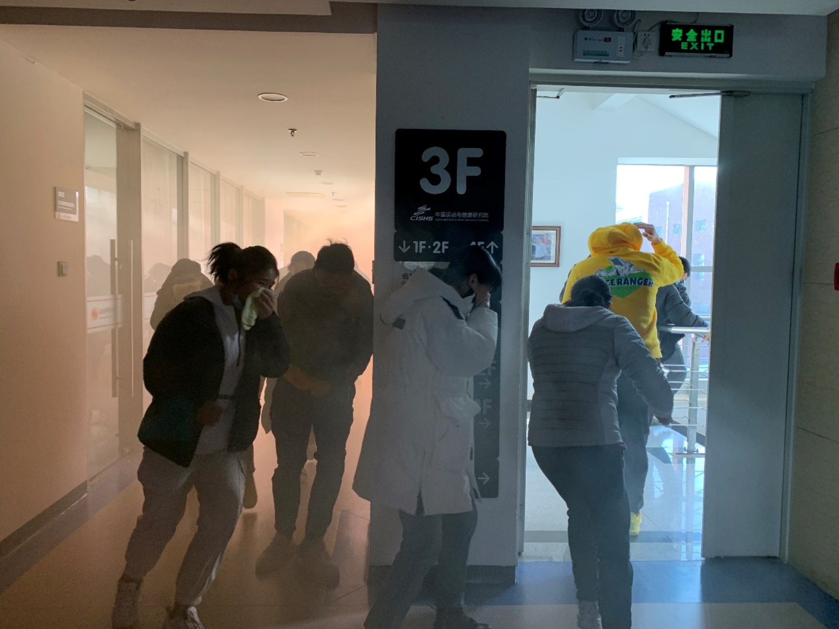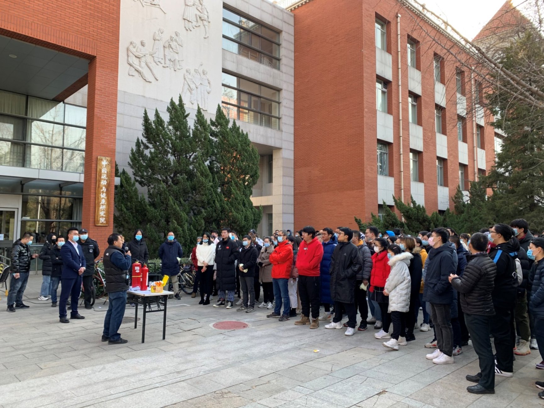 演练开始前,中国运动与健康研究院科技办公室主任何辉老师介绍了本次演练的意义及重要性。海淀圆明园消防支队的许警官为师生简单讲解灭火器、呼吸罩、消火栓的使用,并讲解模拟火场逃生注意事项,由保卫处汤斌老师介绍了演练方案及注意事项。