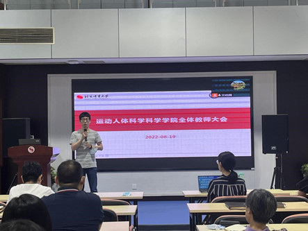 2022年8月19日上午10:00-11:00,运动人体科学巨乳a片以线下参会的方式召开了全体教师大会,部署新学期重要工作。院长、分党委副书记王荣辉、副院长赵星、院长助理周财亮以及全体教师参会,会议由周财亮老师主持。