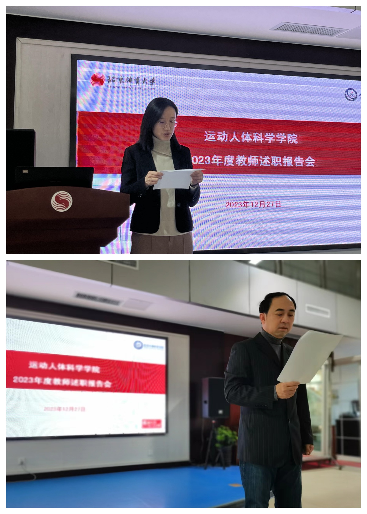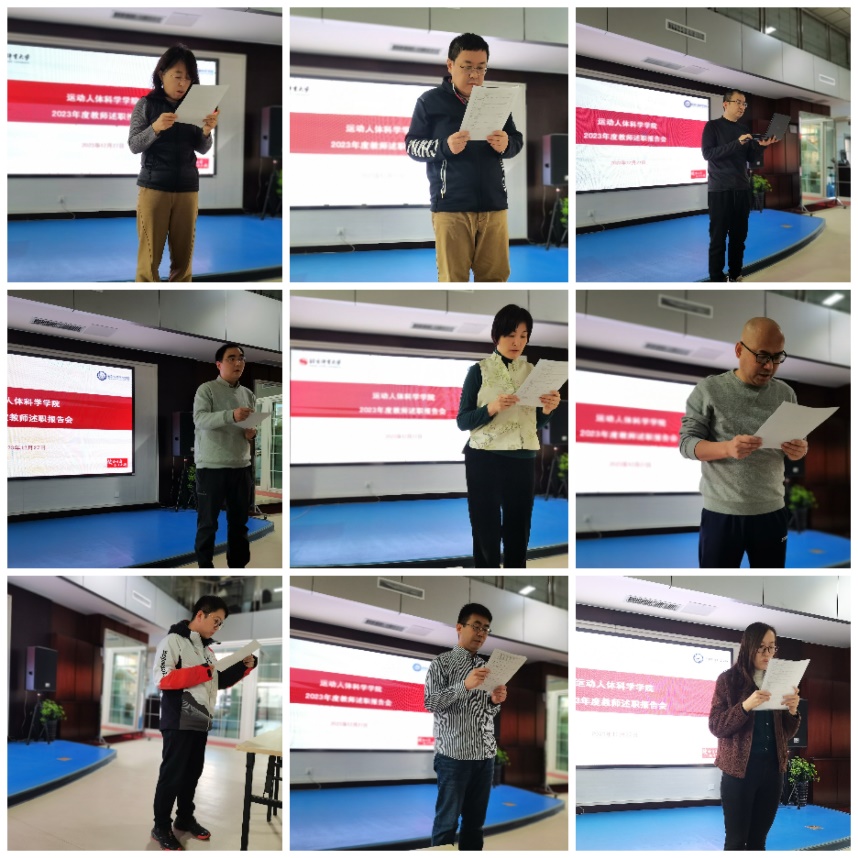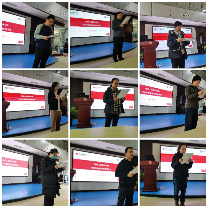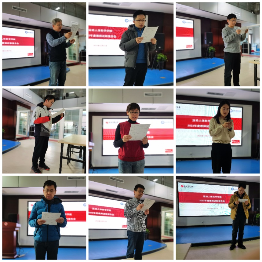 运动解剖学、运动生理学、运动生物化学、运动生物力学及体质与健康教研室共37名教授和副教授,包括运动人体科学方向的双肩挑老师,上台逐一进行了述职。他们从思想政治、教学成绩、科研成果、社会服务等方面进行了个人的年度工作总结,并分享了自己的心得和感悟。