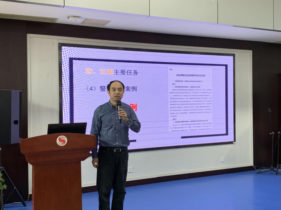 随后,王院长提出了对全体教师们教学科研工作的4条要求。第一,要求教师们上课步入常态化,课表中的课都需要线下进行。第二,希望全体教师多多支持推行的同行专家督导制度。第三,提出了学生管理等相关问题,希望老师平衡好学生的时间,以学生的学业为重。第四,对科研经费报账的问题进行了强调。
