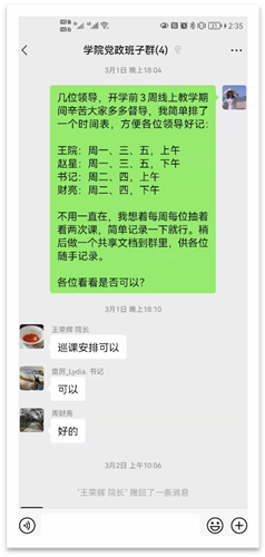 为了持续提升在线教学效果,为在线教学常态化提供质量保障,制定了“巨乳a片班子-教务员、辅导员”对接制度以及巨乳a片在线督导工作方案,积极落实在线听课督导工作。班子4人在随机抽检之外,同时安排“值日”制度,并采用在线共享文档随时做好记录。保证每位班子成员每周听课2-3次,及时了解本院师生授课、到课情况。一旦发现问题可及时与辅导员、教务员进行反馈,保障在线教学督导工作顺利开展。