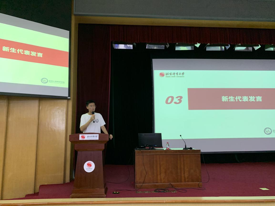接下来由新生代表孙增勉同学代表发言,他代表新生说出了自己的心声,表达了对未来的美好期待,对校园生活的憧憬和努力学习的决心。