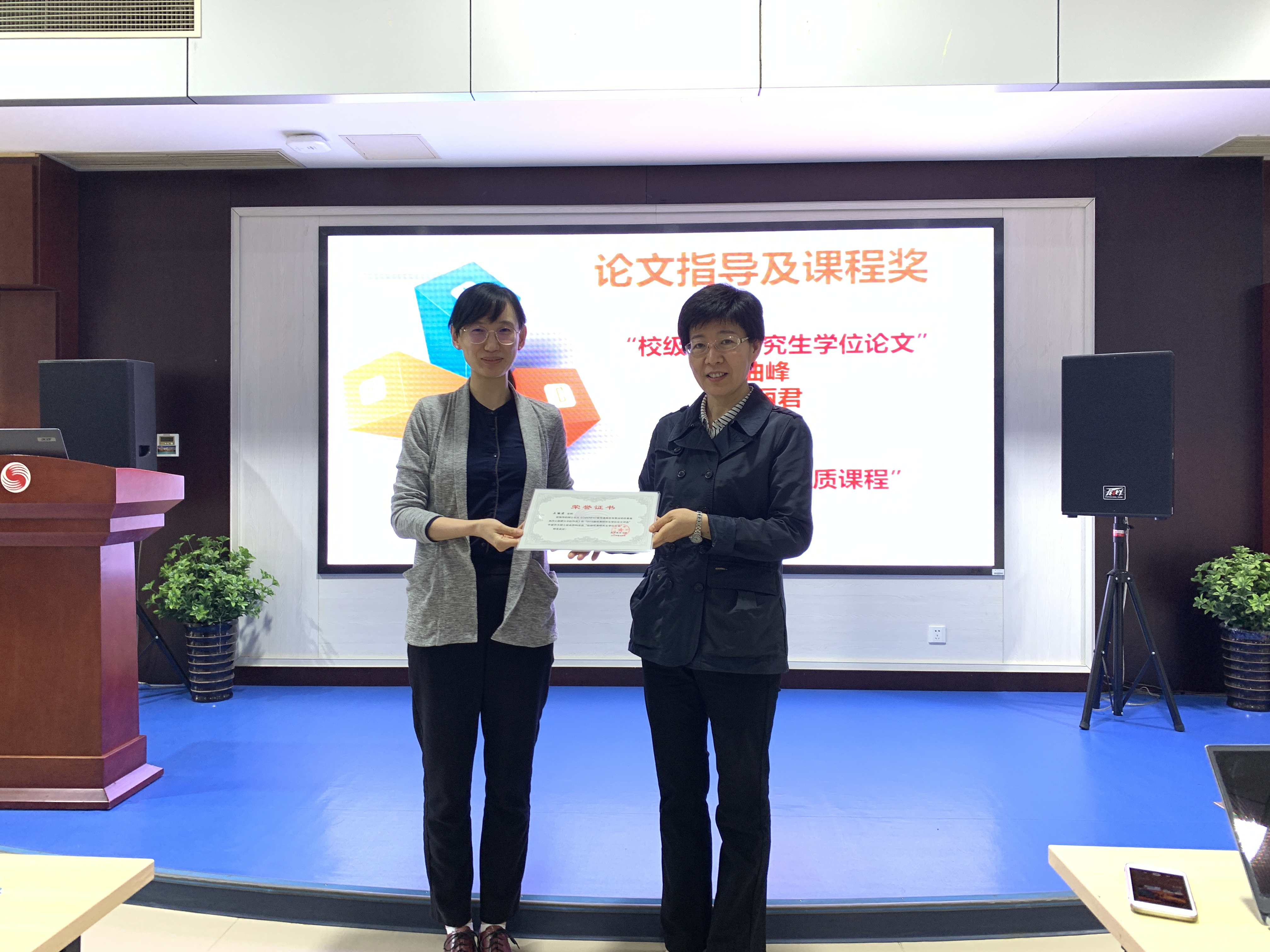 其次颁发的是“校级优秀研究生学位论文”奖和“校级研究生优质课程”。曲峰老师指导的博士论文《基于下肢生物力学特征的髌骨关节痛危险因素分析》在“2018届优秀研究生学位论文评选”中被评为博士组自然科学类“校级优秀研究生学位论文”,石丽君老师指导的硕士论文《CaN/NFAT信号通路在有氧运动改善高血压心肌肥大中的作用》被评为硕士组自然科学类“校级优秀研究生学位论文”。石丽君老师主持的课程《运动生理学方向硕士专业课》在“2018年研究生优质课程评选”中被评为“校级研究生优质课程”。