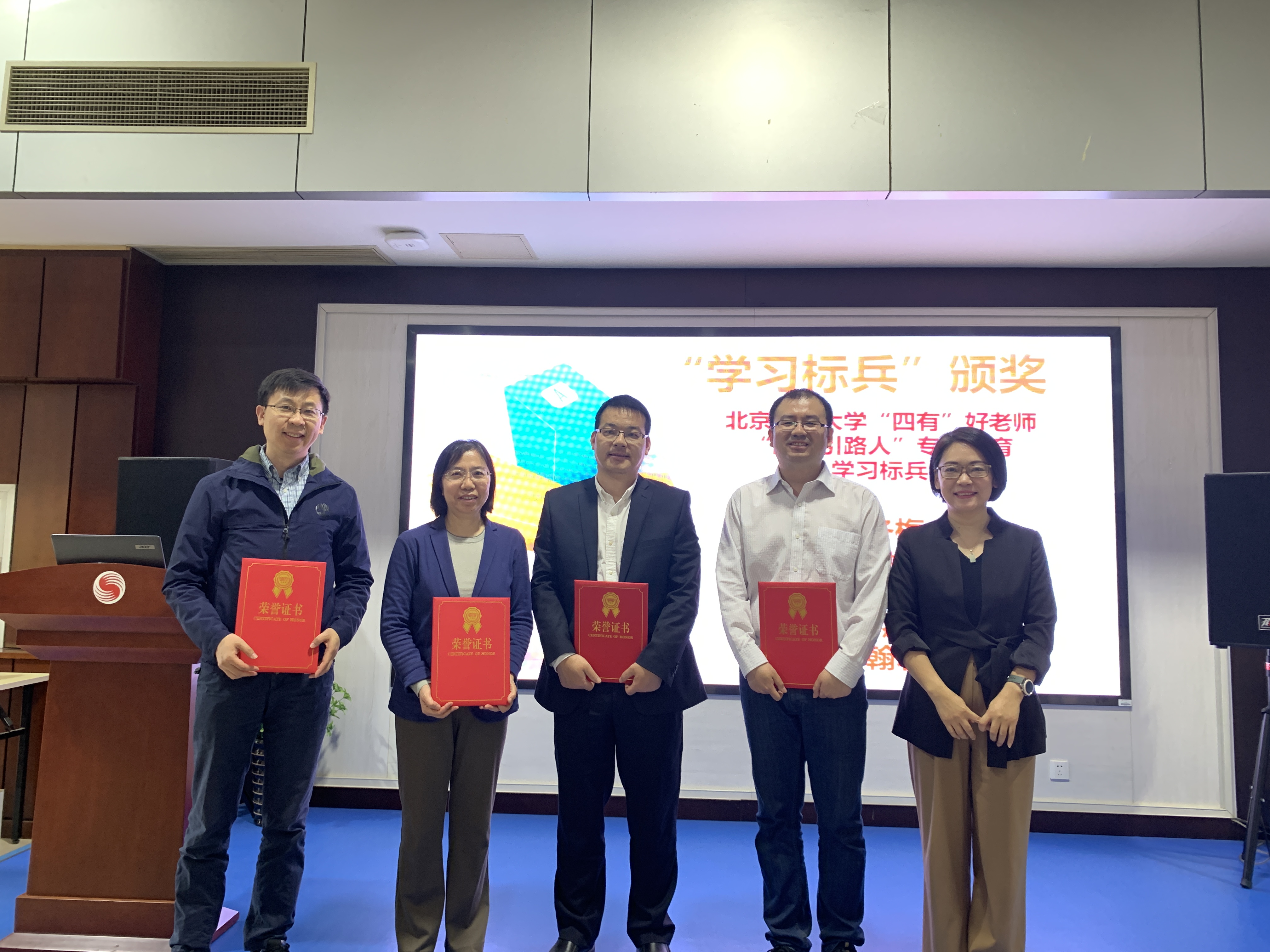 “四有”好老师和“四个引路人”专题教育活动中的“学习标兵”奖,获奖者有罗冬梅、曹建民、汪军、李然和李翰君五位老师。