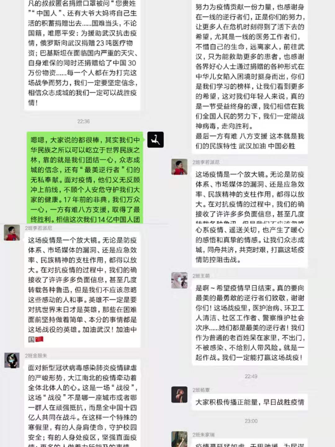 班级同学们积极参与班会活动,认真收看本期节目,受到勇赴抗疫一线“逆行者”们的使命感、家国情怀的触动,千里河山,心意项链,一方有难,八方支援。大家自发在群内接力回复“致敬最美逆行者”并交流感想,还有许多同学主动分享观看节目后内心最真实的感触,并表达战胜疫情的决心和对国家以及医护人员的信心。