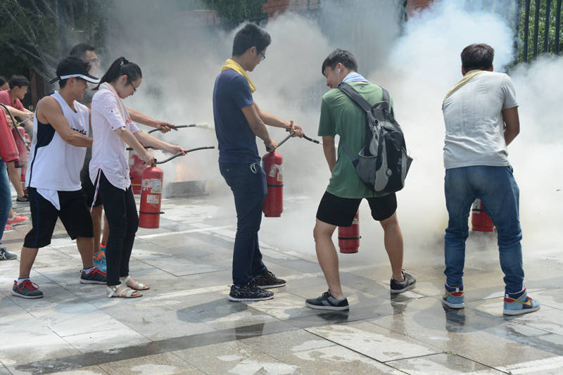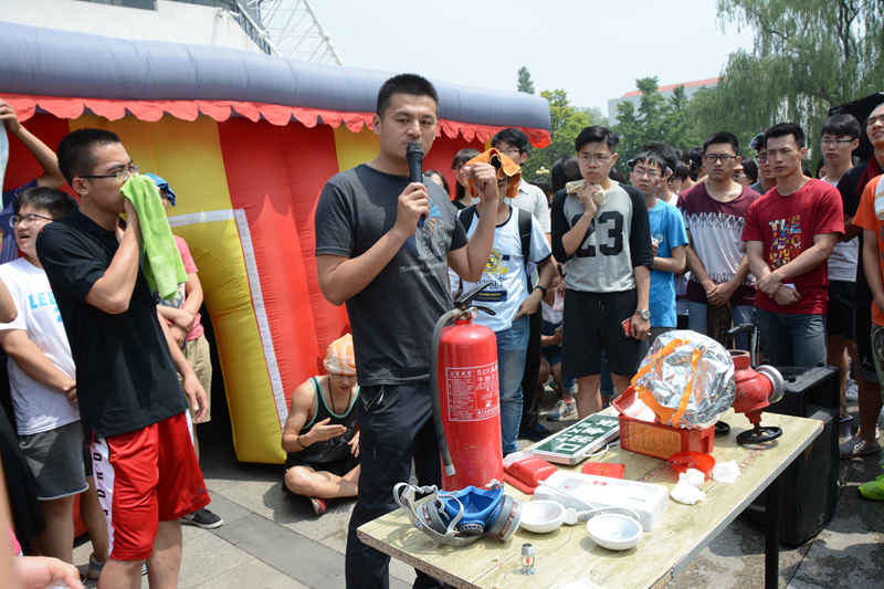 活动开始,保卫处付强老师就应急逃生办法和逃生姿势进行简要介绍,同时讲解了如何利用毛巾等生活用品帮助逃生的方法。其中,应急逃生强调“停”“想”“做”三点,他从三个基本步骤讲解了危急情况发生后当事人应该采取的措施。模拟火灾现场进行了演练,使学生加深了对逃生知识的理解和记忆。付强老师又详细讲解了不同灭火器的适用范围和使用方法,并指导同学们进行现场灭火演练。